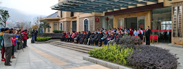 学员们在“老年城”综合楼前为全体养员和护理员拍摄集体照