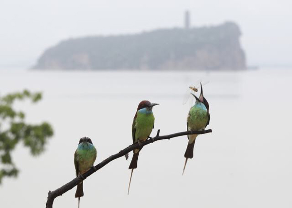 这是2015年6月14日,三只蓝喉蜂虎在江西鄱阳湖畔的树枝上休憩。 新华社发(沈俊峰 摄) |