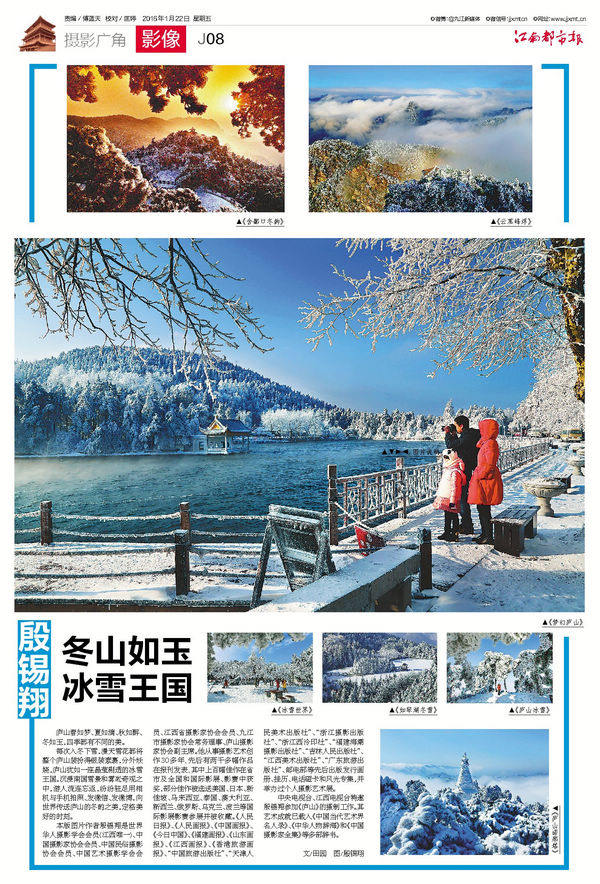 九江摄影网讯(田园) 1月22日,《江南都市报》J08版摄影广角·影像专版全彩版刊登了世界华人摄影学会会员(江西唯一)、中国摄影家协会会员、中国民俗摄影协会会员、中国艺术摄影学会会员、江西省摄影家协会会员、九江市摄影家协会常务理事、庐山摄影家协会副主席殷锡翔的摄影艺术作品选登专栏《冬山如玉 冰雪王国》。本网特予以转载。