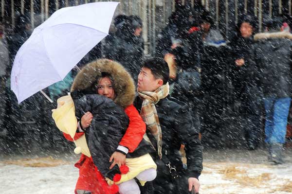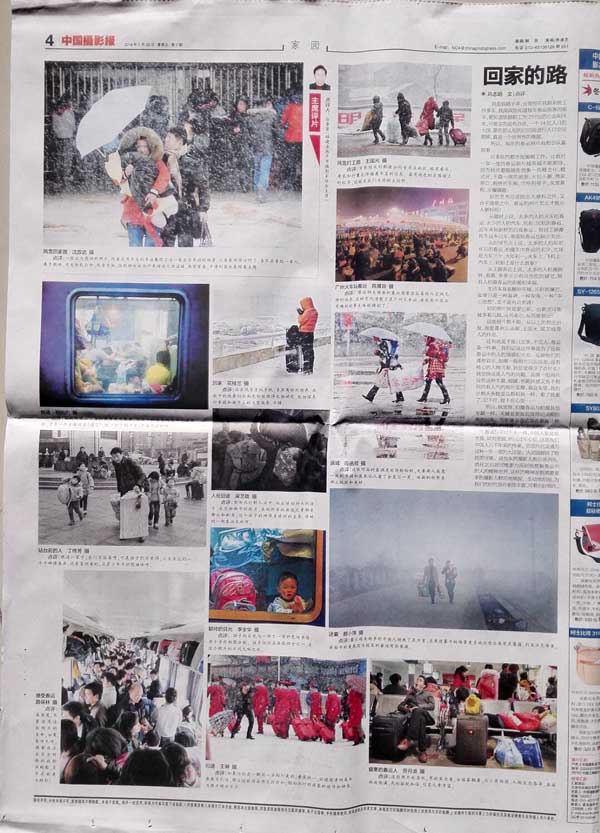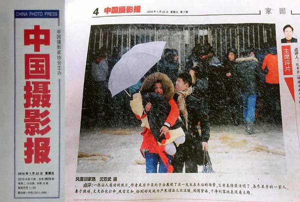 九江摄影网讯(宋小勇)1月22日《中国摄影报》4版“家园”,以版面头条的形式,刊发了沈双武的摄影作品《风雪回家路》,并加了“主席评片”,点评人是福建省南平市摄影家协会主席张章景。张章景主席在点评中说:“一张让人感动的照片,作者采用平实的手法展现了这一发生在车站的场景。父亲表情简洁明了。各尽其责的一家人:妻子抱娃,丈夫拎包打伞。风雪交加,恰到好处地为严寒增添几丝温暖。构图紧凑,干净利落地表现着主题。 沈双武(网名江南)系中国摄影家协会会员、九江市摄影家协会副秘书长。《风雪回家路》(组照)曾获得第4届九江市摄影艺术展览金奖。