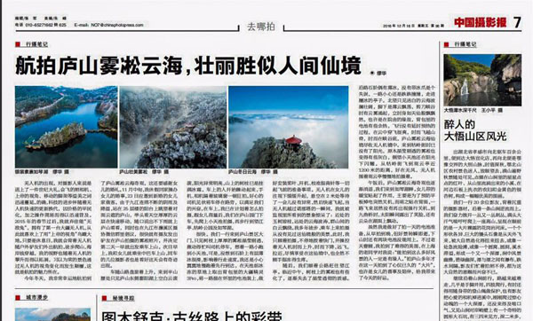 九江摄影网讯(木力)2016年12月16日的《中国摄影报》第7版头条位置,刊发了江西省摄影家协会会员、九江市摄影家协会会员、濂溪区摄影协会理事缪华的“行摄笔记”:《航拍庐山雾凇云海 壮丽胜似人间仙境》,并且配发了3幅航拍庐山雾凇云海的作品。现在本网转发,以飨网友。