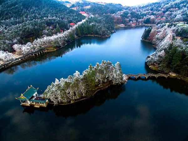 午饭后,庐山雾凇云海奇观也逐渐消退,我们来到如琴湖畔。女儿带的暖宝贴起了作用,主要是为了预防平板掉电突然关机,而将之贴在背面,一路飞来居然没有再出现强行关机。到九曲桥时,太阳瞬间露出了笑脸,还有云朵在湖面上飘动。