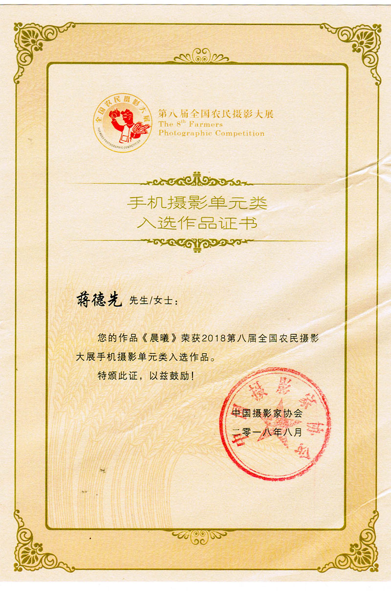 本届农民大展共选出150幅入选作品,120余位作者获此殊荣。其中江西入选3幅作品,中国摄影家协会会员、武宁县摄影家协会主席蒋德先的作品《晨曦》再次获得入选。这也是蒋德先连续第5次有作品入选全国农民摄影展览。当天下午,第八届全国农民摄影大展研讨会于中华世纪坛剧场举行,本届农展评委和入选作者就如何用摄影手段有效反映农村发展状况、如何将当代摄影的最新发展趋势与新农村摄影相结合等问题展开讨论,共同展望农民摄影题材的新发展、新未来。