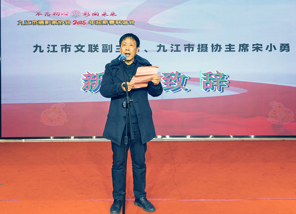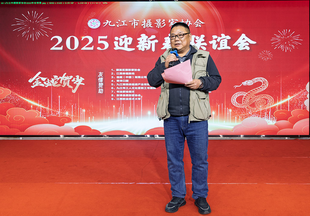 联谊会场景 九江摄影网讯 2025年1月19日下午,为活跃九江摄影爱好者的业余生活,增进摄友之间的学习与交流,在中国传统春节到来之际,九江市摄影家协会举行2025年迎新春联谊会。 九江市委原副书记、正厅级巡视员、市摄协顾问张华东,九江市文联党组书记、主席周光灿,九江市文联原党组书记陆建珠,九江市文联党组成员、副主席王定君,九江市文联副主席、九江市摄协主席宋小勇,江西幸福数码总经理蔡定玲,特邀理事夏文川、陈飞林、周云飞、肖明、吴从华、宋斌、周志勇,在家的班子成员、顾问、名誉主席,以及来自全市和县(区、市)的摄影爱好者共300余人参加了联谊活动。