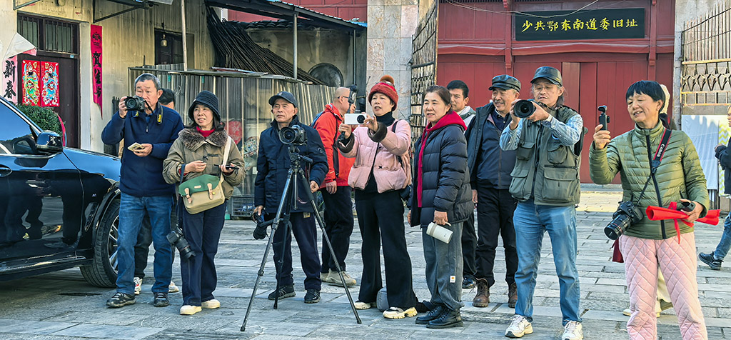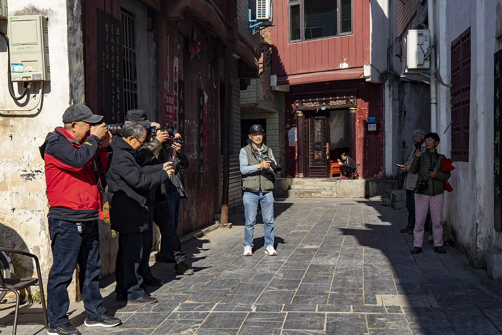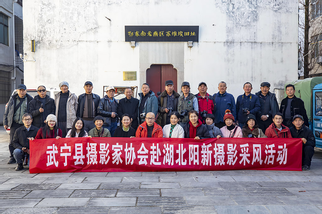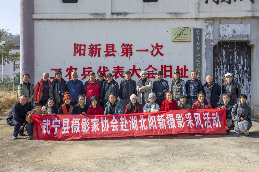 龙港红军街合影 抵达龙港镇已过正午,简餐后,采风团来到此行最后一站——龙港红军街与鄂东南特委旧址。街道旧貌依然,红旗标语与革命旧址依次呈现,行走其间,仿佛听见历史的回响。大家以镜头致敬这片红色热土。 当日下午,采风活动圆满结束。会员们的存储卡中,装满了阳新的湖光山色、古韵人文与红色记忆;而更珍贵的,是那些共同观摩、相互启发、欢声笑语的瞬间。这次以摄影为媒、以大地为卷的深度交流,不仅跨越了地域,提升了创作技艺,更在并肩行走与共同凝视中,培育出真挚深厚的情谊。 此次采风活动是武宁县摄协成立以来组织规模最大、参与人数最多的一次外出创作,成果丰硕、意义深远。活动的顺利开展,得益于会员们的积极参与与组织人员的辛勤付出,更离不开阳新摄协——特别是孙章辉主席全程深入、倾心尽力的陪伴与指导。他不仅是地理与行程的向导,更是艺术创作的同行者和思想交流的挚友,从拍摄选址、时机把握,到现场构图与技法探讨,皆无私分享、悉心指点。此行大家收获的,不仅是镜头下的美景,更是心灵的触动、技艺的提高与友谊的升华。 (蒋德先 李小可 柯一白 李春玲 潘盛林 舒 妮 摄影)