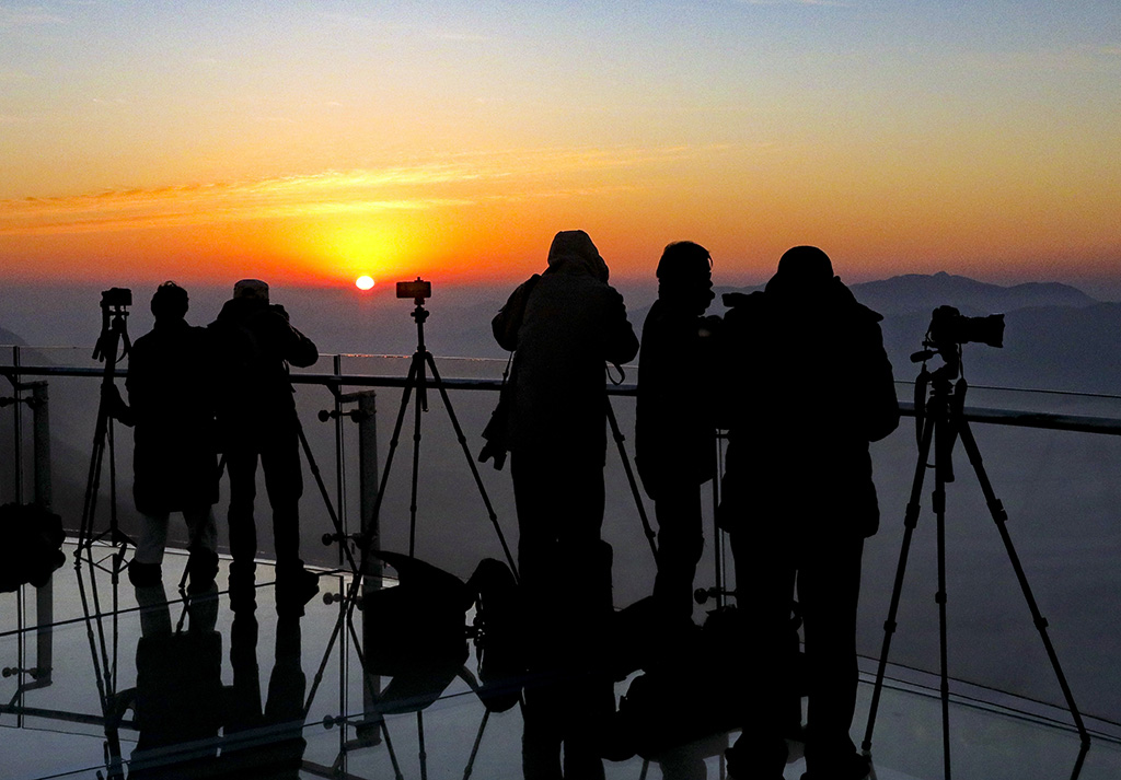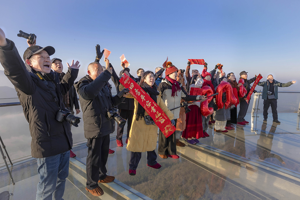 天空之城合影 28日清早,采风团驱车登顶天空之城。立于高空玻璃观景台,只见仙岛湖云海翻腾,如梦似幻。旭日自云隙间缓缓升起,霞光浸染云涛,山岛隐现其间,宛如仙境。众人抓紧这珍贵的光影时刻,记录下云海日出的壮丽景象。