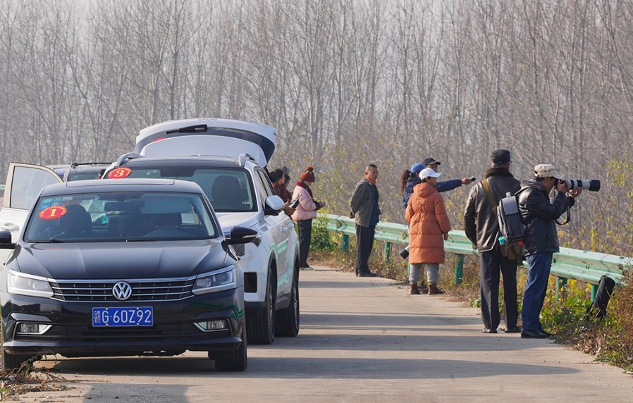 网湖候鸟驿站合影 当晚,采风团入住由黄石市摄影家协会副主席、阳新县摄协副主席张雯创办的网湖候鸟驿站。驿站摄影氛围浓厚,令人倍感亲切。阳新摄影同仁设宴相聚,两地影友把盏畅谈,交流创作心得,席间洋溢着真挚的同行之谊。 27日清晨,天色未明,众人已在孙主席指引下登上网湖大堤,静候日出。晨光渐染,湖天一色,数以万计的候鸟翩跹起舞,或掠过水面,或成群盘旋。快门声此起彼伏,大家全心捕捉这片生机盎然的瞬间。 早餐后,团队再次深入候鸟聚集区进行拍摄。朝阳下的湖滩更显活力,鸟群姿态各异,为创作提供了丰富素材。随后,队伍启程前往仙岛湖。