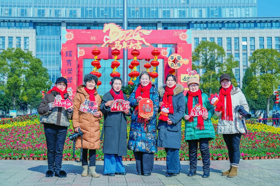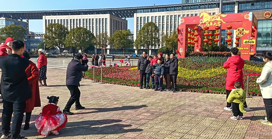 活动首日,市府广场国旗台前便洋溢着节日的喜庆与温馨。摄影师们精心选取以鲜艳春节花坛布景的最佳角度,捕捉每一个自然流露的幸福瞬间。