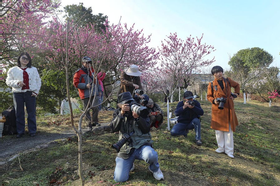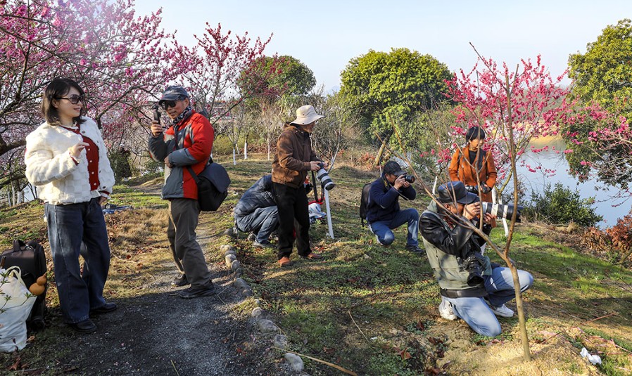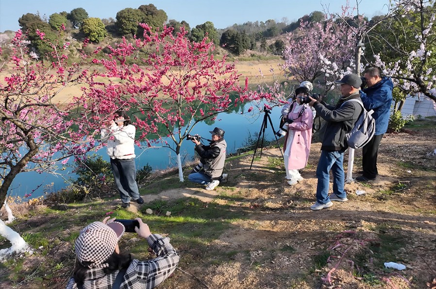 14日清晨,采风团一行抵达了此次采风的首站——阳光照耀29度假区花源谷。大家乘坐游艇登上桃花岛,但见岛上嫣粉点点,一树树桃花在枝头竞相绽放,与远处烟波浩渺的庐山西海交相辉映,构成了一幅绝美的山水春色图。会员们很快进入创作状态,或蹲或站,或登高望远,纷纷举起“长枪短炮”,从不同角度捕捉着海岛花园春天的讯息。大家充分利用水面倒影,将盛开的桃花与连绵的岛屿框入画面,记录下了这一幅幅唯美画图。