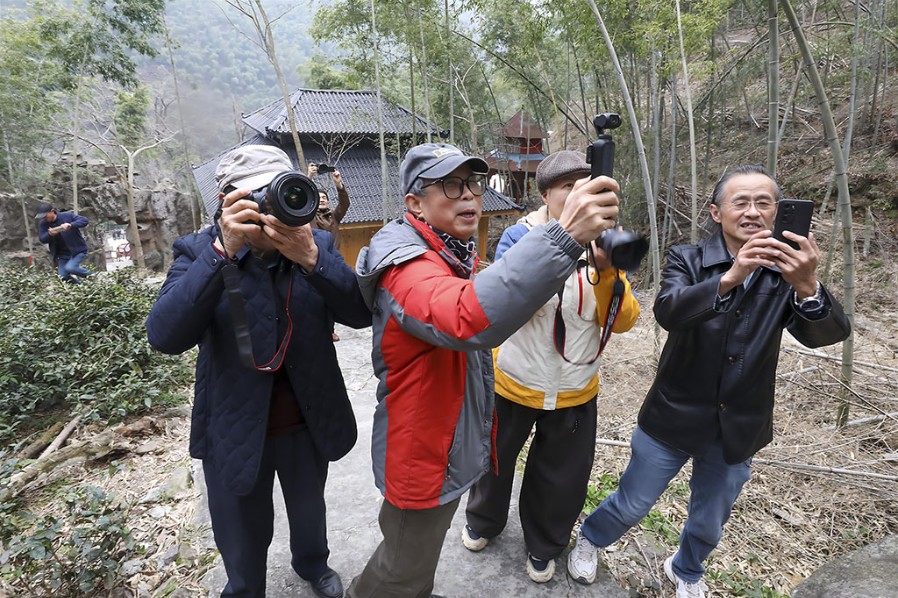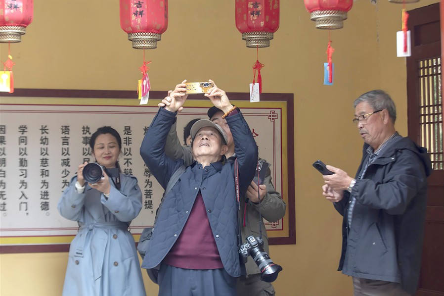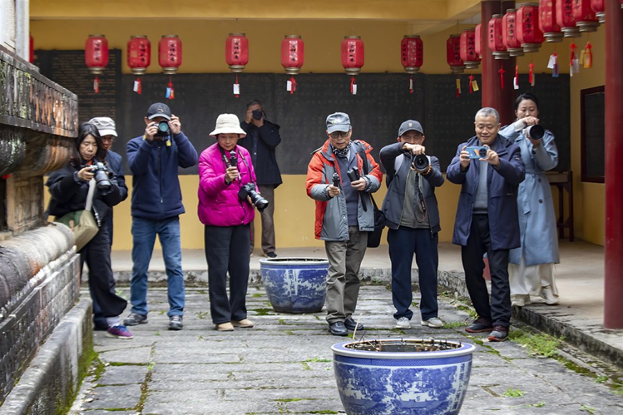 弥陀寺合影 15日上午,采风活动继续。采风团一行首先探访了深藏于杨洲山林之间的千年古刹——弥陀寺。古寺红墙黛瓦,在参天古木的掩映下愈发显得庄严肃穆。晨钟暮鼓,梵音袅袅,自有一派超然气象。院内玉兰芬芳、茶花争艳、牡丹含苞,暗香浮动。会员们在这份难得的宁静中,用心感受,用镜头细腻地捕捉着佛教文化与自然山水和谐共生的禅意之美。