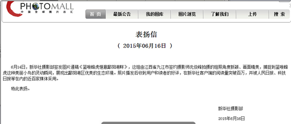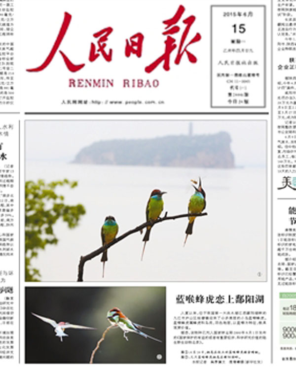 九江摄影网讯(宋小勇)6月15日的中共中央机关报——《人民日报》,在第15版“生态”版上,刊发了由新华社播发的九江摄影师、中国全球图片总汇签约摄影师沈俊峰6月14日拍摄的《蓝喉蜂虎恋上鄱阳湖》两幅通稿作品。 《蓝喉蜂虎恋上鄱阳湖》(组照)同时被媒体刊发的还有:新华网、人民网、《中国日报》中文网、搜狐网、中国台湾网、华夏经纬网、今视网、中国网传媒经济、深圳新闻网等。 6月16日,新华社摄影部在中国全球图片总汇网上发布《表扬信》,表扬沈俊峰拍摄的这组好照片。《表扬信》中说:6月14日,新华社摄影部签发图片通稿《蓝喉蜂虎惬意鄱阳湖畔》,这组由江西省九江市签约摄影师拍摄的组照角度新颖、画面精美,捕捉到蓝喉蜂虎这种美丽小鸟的灵动瞬间,展现出鄱阳湖区优美的生态环境。照片播发后收到用户和读者的好评,在新华社客户端的阅读量突破百万,并被人民日报、科技日报等在内的近百家媒体采用。特此表扬。