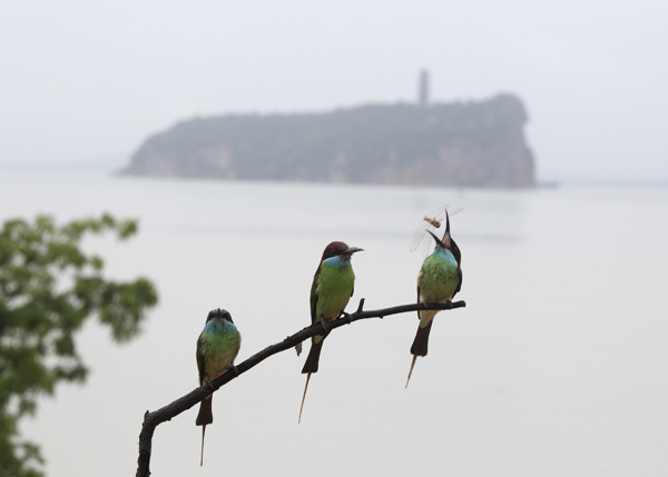 几只蓝喉蜂虎栖息在鄱阳湖畔。 沈俊峰 摄