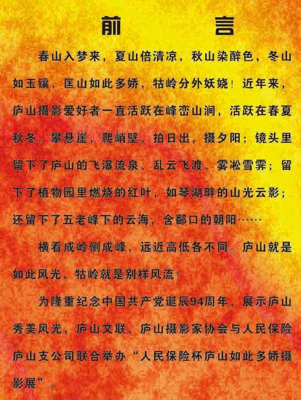 九江摄影网讯(李敏)7月17日上午,由庐山文联、庐山摄影家协会主办的“人民保险杯”《庐山如此多娇》摄影展在庐山旅游中心举行。庐山管理局副局长王迎春、虞慧群,宣传部长熊伟,调研员李应友,江西日报九江分社副社长燕平,九江日报副总编、九江市摄协主席宋小勇及中国人保九江、庐山公司的领导参加了开展式。展览展出作品90幅。