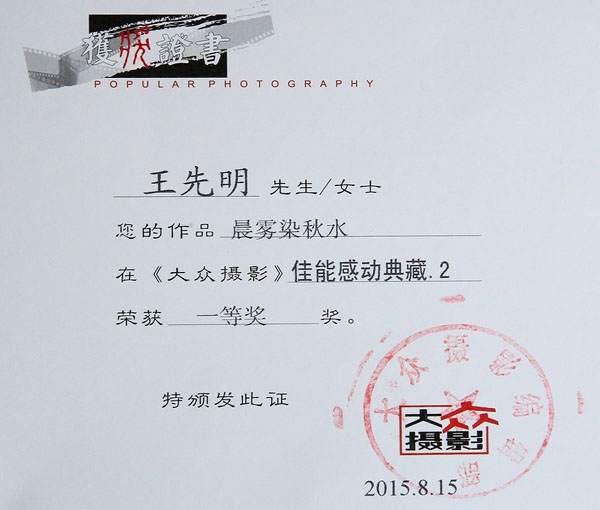 九江摄影网讯(木力)日前,从中国摄影家协会主办的《大众摄影》编辑部传来喜讯,九江摄影师王先明的作品《晨雾染秋水》,在《大众摄影》佳能感动典藏.2摄影月赛中,荣获一等奖。 王先明为江西省摄影家协会会员、九江市摄影家协会理事。