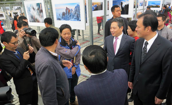 九江摄影网(木力)11月21日上午,由中国摄影家协会、北京电影学院、上饶市人民政府共同主办的2015“金驹杯”世界大学生摄影展开幕式在上饶市市民公园举行。江西省委常委、省委秘书长朱虹,江西省原副省长熊盛文,上饶市委书记陈俊卿,中国文联副主席李前光,中国摄影著作权协会副主席宋明昌,北京电影学院校长张会军出席并启动摄影展开幕;上饶市委副书记、市长马承祖致辞;中国摄影家协会副主席邓维、索久林,江西省旅发委主任丁晓群,江西省广电局局长杨六华,上饶市领导陈建辉、朱寅健、徐金香等出席。上饶市委常委、三清山风景名胜区党委书记陈晓平主持开幕式。九江市摄影家协会主席宋小勇、九江市公安摄影协会主席熊敏宇,九江学院艺术学院副教授熊晓洁、吴晨晖等参加了开幕式和展览活动。