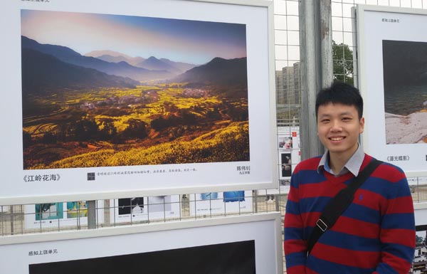 九江学院学生陈伟钊在自己展出的作品前留影。