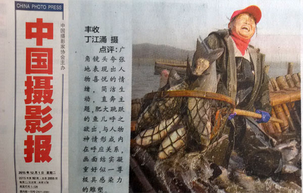 九江摄影网讯(木力)2015年12月1日的《中国摄影报》第4版“家园”版“丰收”专题,刊发了九江摄影师丁江涌的作品《丰收》,并配发了点评。点评中说:广角镜头夸张地表现了人物喜悦的情绪,简洁、生动,直奔主题,肥大跳跃的鱼儿呼之欲出,与人物神情形成内在呼应关系,画面结实凝重好似一尊重极具感染力的雕塑。 丁江涌系江西省摄影家协会会员,近年来多次在摄影比赛中获奖。其中作品《情定边情》(组照)入围湖南省摄影家协会联手湘西烟雨凤凰旅游演艺有限公司共同主办“2015《边城》·凤凰全球擂台赛”。