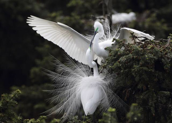 这是2015年4月25日,两只白鹭在江西省新建县象山森林公园的树林中亲昵。 新华社发(沈俊峰 摄)