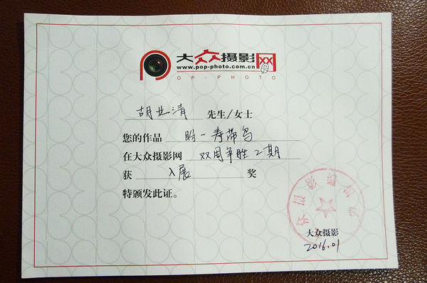 )日前,庐山摄影协会胡业清作品《盼——寿带鸟》在“大众摄影网”张张丽双周争胜2016年第2期《动物》赛中获入展奖。