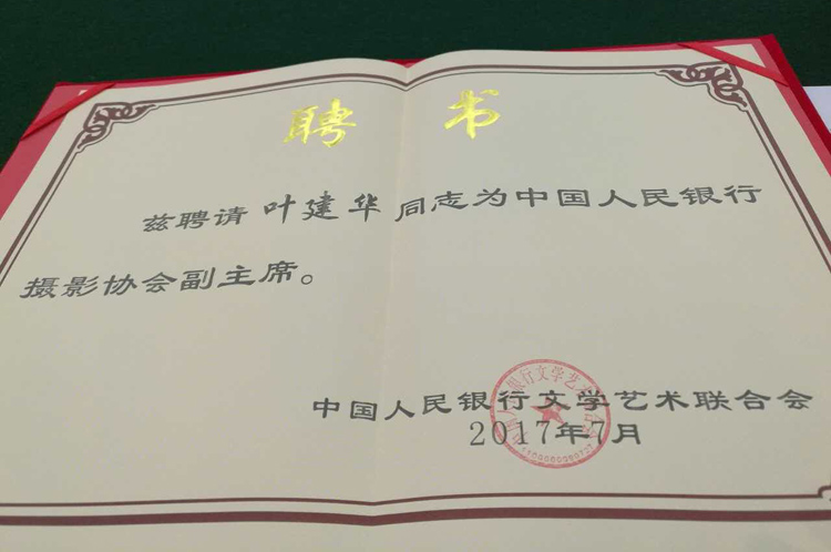 叶建华原为中国人民银行总行摄影协会秘书长、九江市摄影家协会副主席。最近荣升为南昌中心支行党委委员、工会主席。