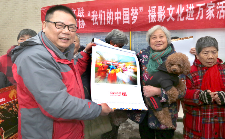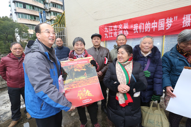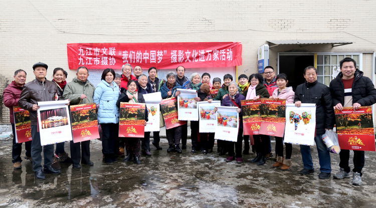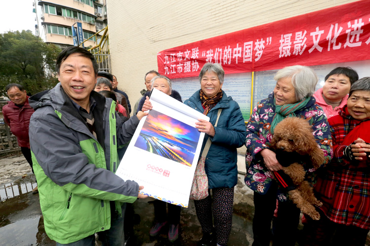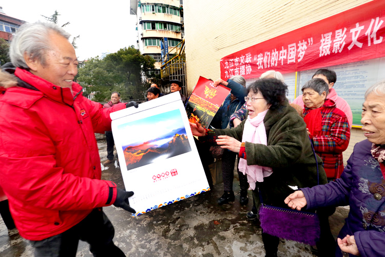 九江摄影网讯(木力)连日来,九江市文联、九江市摄影家协会组织我市部分摄影家,组成“红色文化轻骑兵”,到乡村、进社区,开展“我们的中国梦——摄影文化进万家”活动,为乡村贫困户、社区居民、老党员赠送摄影家们自己拍摄制作的文化挂历。在新春佳节到来之际,他们还将组织开展摄影文化进基层活动,聚焦我市社会发展、群众生活等,为节日文化增添喜庆气氛。