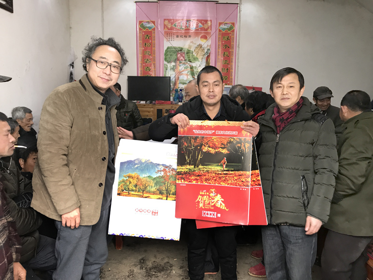 市文联副调研员、市作协主席蔡勋与市摄协副主席陈杰向都昌县周溪镇花桥村赠送挂历