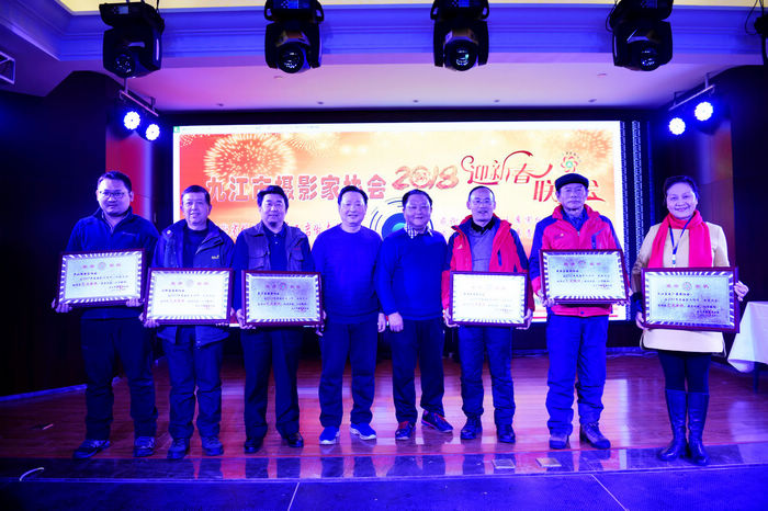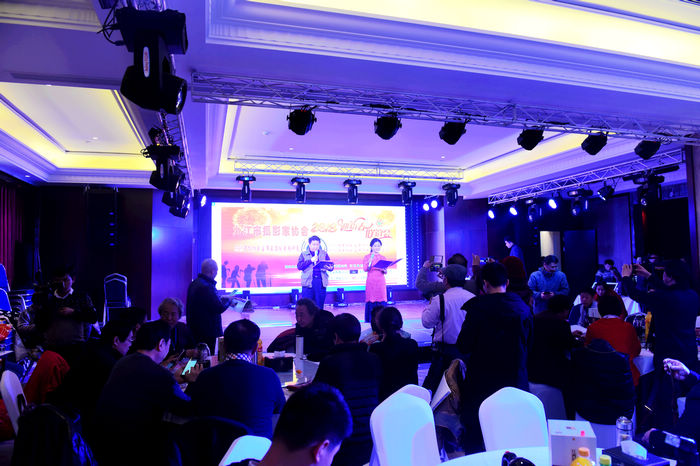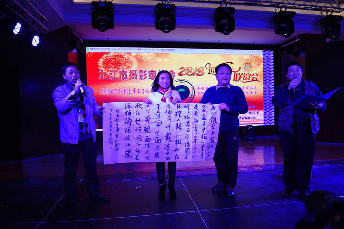 联谊会现场 九江摄影网讯(沈双武)1月27日下午,九江市摄影家协会2018年迎新春联谊会在铂悦仙境酒店隆重举行。市政协原巡视员、市摄协顾问张华东,九江市摄协特邀理事、江西省国税局副巡视员夏文川,市文联调研员陆建珠,九江市摄协特邀理事、九江广播电视台总编周云飞,国电九江发电厂原纪委书记、工会主席吴从华,九江市摄协特邀理事、市政协办公厅原调研员郭建林,九江市摄协常务理事、九江太保财险公司原总经理肖明,九江市摄协特邀理事、原庐山区人大常委会主任陈飞林,九江市摄协特邀理事、原庐山区政协副主席宋斌,九江市摄协顾问、九江市职工摄协主席田小元及赞助单位负责人应邀出席。在九江的市摄协班子成员、主席宋小勇,副主席杨青、陈杰、罗匡龙,副秘书长沈双武、蔡少敏、李涛渊、张项理和来自全市各基层摄协的近400余名摄影家、摄影爱好者会聚一堂,大家一起分享摄影给他们带来的快乐。雪后交通不便,很多县(市、区)特别是武宁、修水摄协还仍然来参加让与会者感动。 联谊会上,江西省摄协副主席、九江市文联副主席、九江市摄协主席宋小勇致新年贺词,市摄协副主席兼秘书长陈杰宣读了九江市摄影家协会关于表彰2017年度先进集体、优秀会员、终身成就奖的决定,嘉宾和摄协领导为先进集体、优秀会员颁奖。市摄协副主席罗匡龙宣读了新会员名单。特邀嘉宾、江西省摄影家协会副主席、南昌市摄影家协会执行主席王岩应邀为摄友作了《如何突破摄影创作中的瓶颈》专题讲座,我市著名摄影家疏隶书、周继根、蒋德先、丁江涌、傅建斌、袁文辉先后畅谈了优秀摄影作品创作体会。还播放了九江市摄协2018年贺岁专题片、在江西省第24届摄影艺术展览中获奖的多媒体作品。 期间,赞助单位九江巍然数码科技有限公司、江西昊然飞扬摄影俱乐部、江西陶令酒业有限公司、九江九州粮油实业有限公司、奇洋口腔、美的铂悦府、太平洋财险九江中支公司、庐山华微国际度假酒店、铂悦仙境酒店负责人分别作了企业宣传介绍,穿插进行了抽奖活动,表演了基层团体会员单位选送的民乐团合奏、二胡独奏、萨克斯、小提琴合奏、男女声独唱、武术歌舞表演等精彩的文艺节目。这场联谊会还首次应用新媒体技术采用了现场直播的方式。