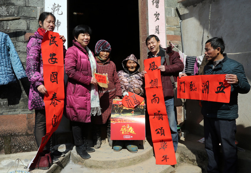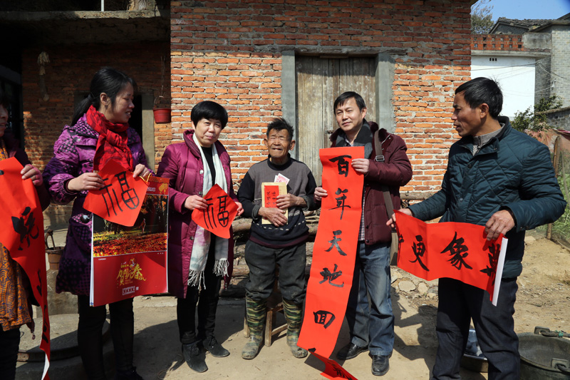 九江市文联领导陆建珠、段虹、蔡勋将春联、摄影挂历送给贫困户