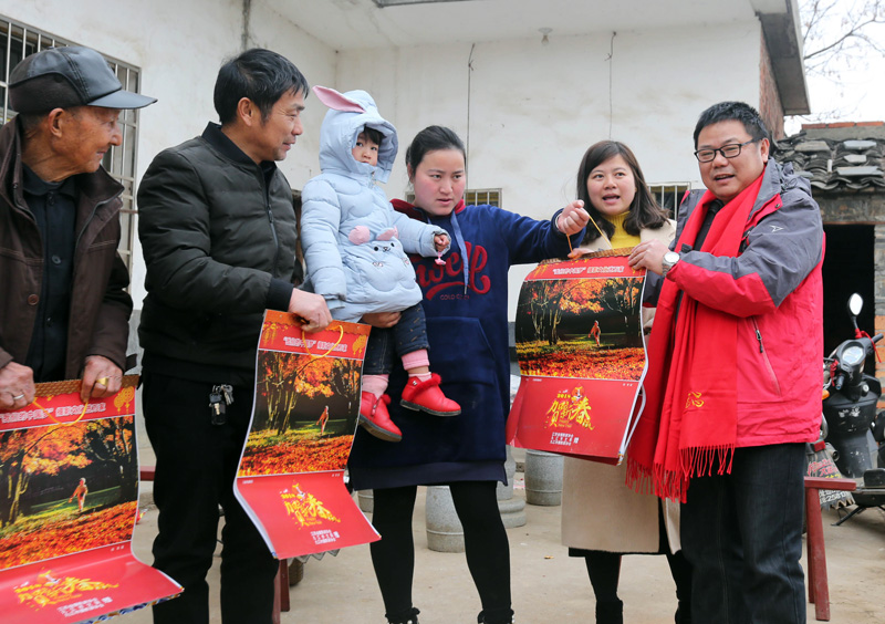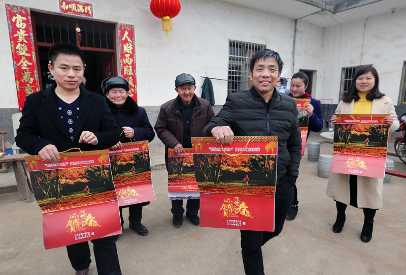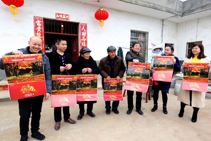 乡亲们拿着挂历合影留念