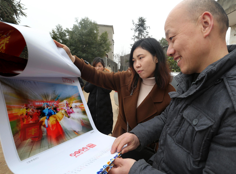 乡亲们观赏挂历摄影作品