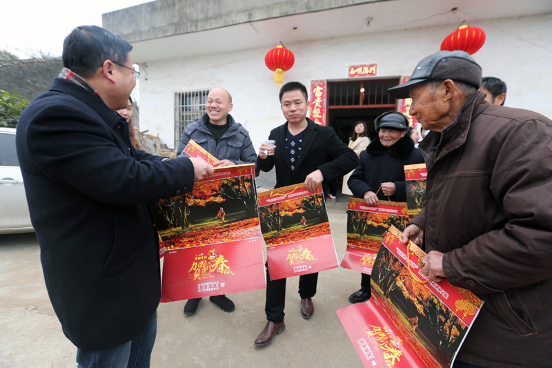 九江市摄协副秘书长李涛渊向乡亲们赠送挂历