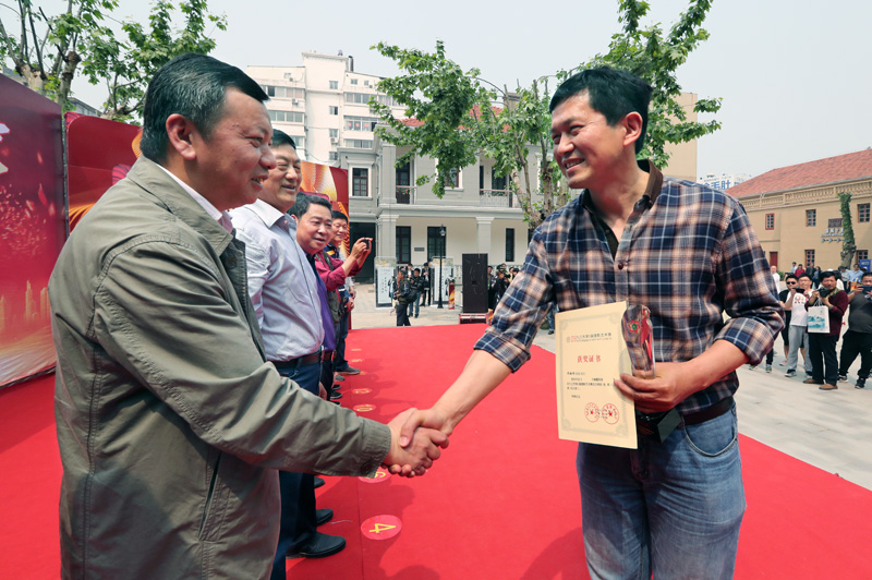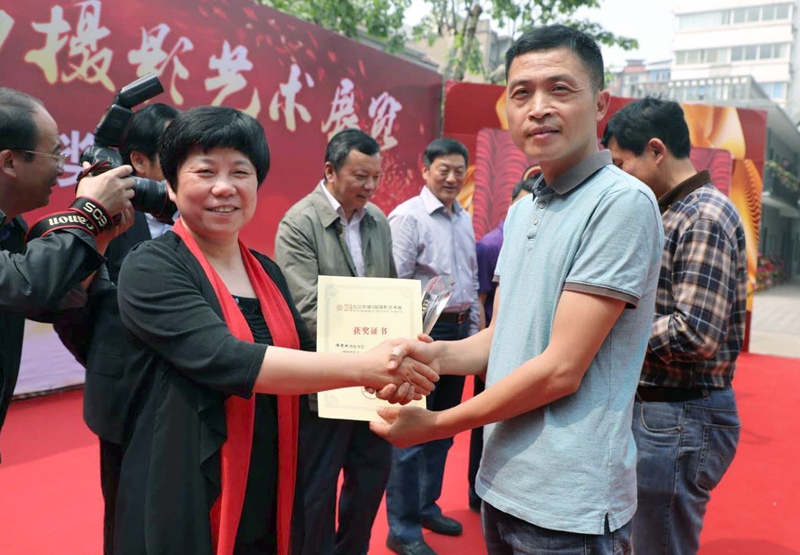 九江市文联调研员陆建珠为社会·生活类金奖获得者傅建斌颁奖