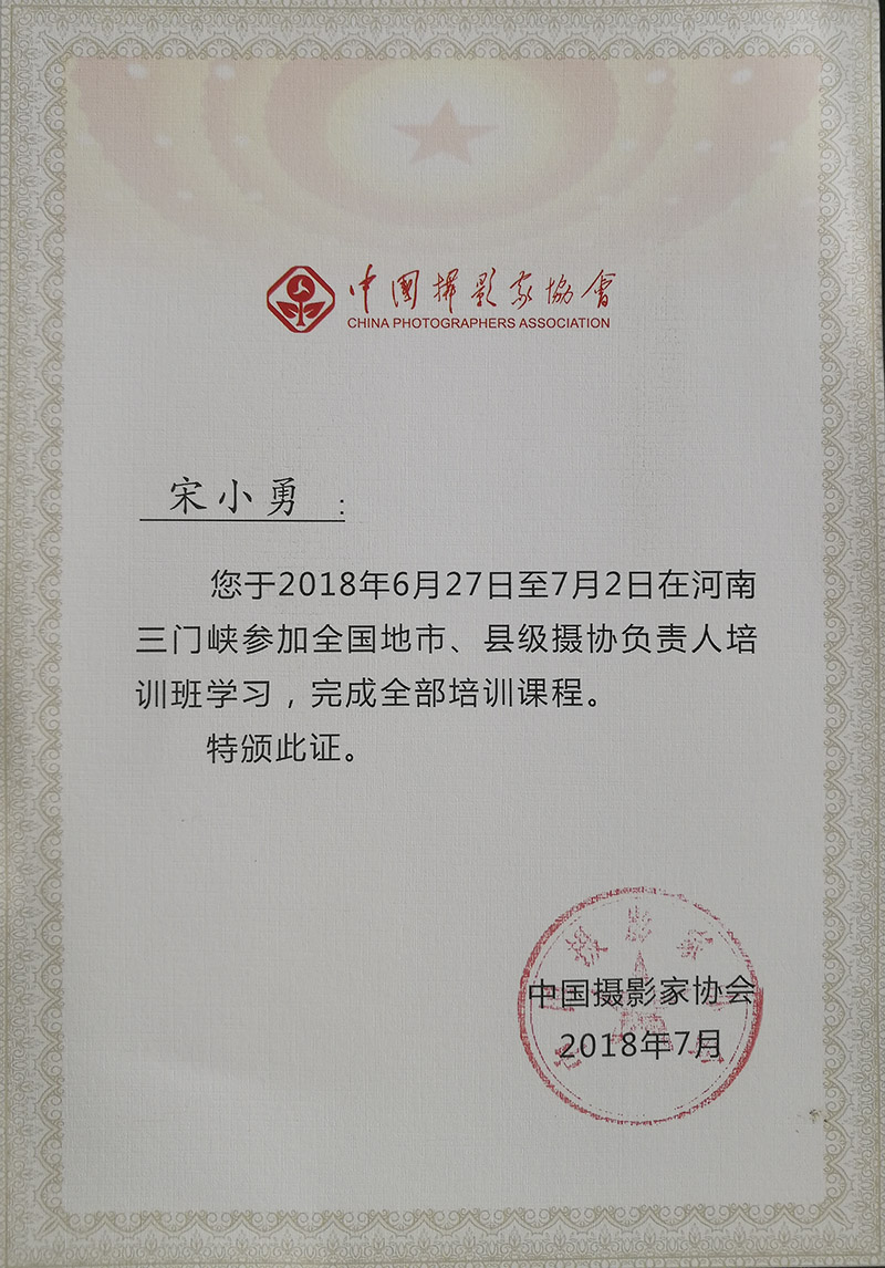 中国摄影家协会为参加培训的学员颁发的结业证书