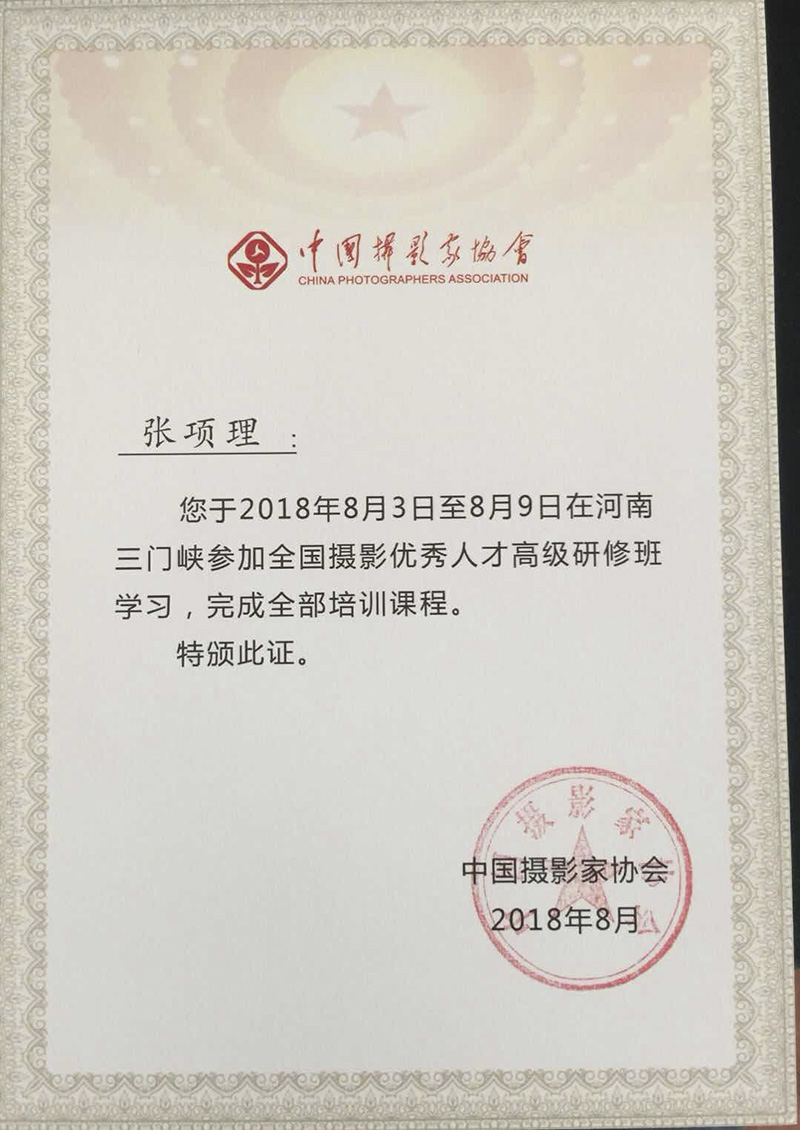 中国摄影家协会为参加研修的学员颁发的结业证书