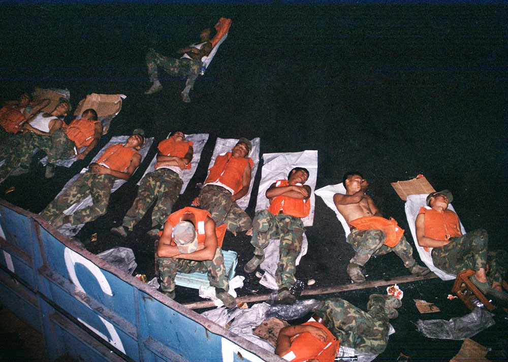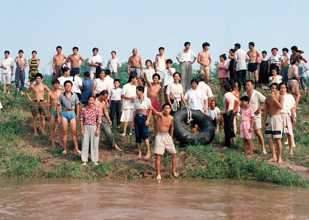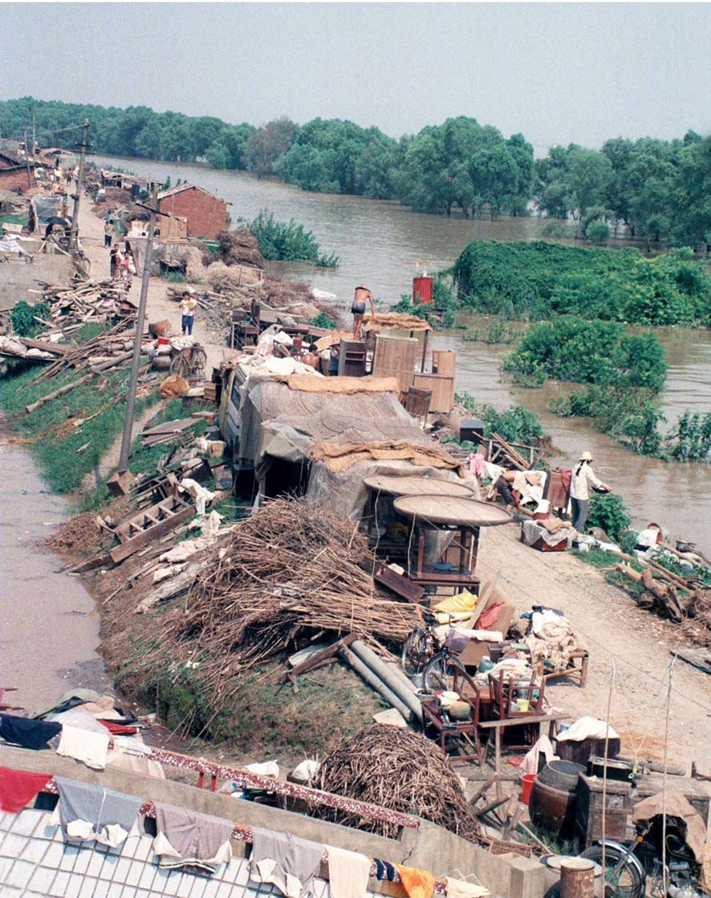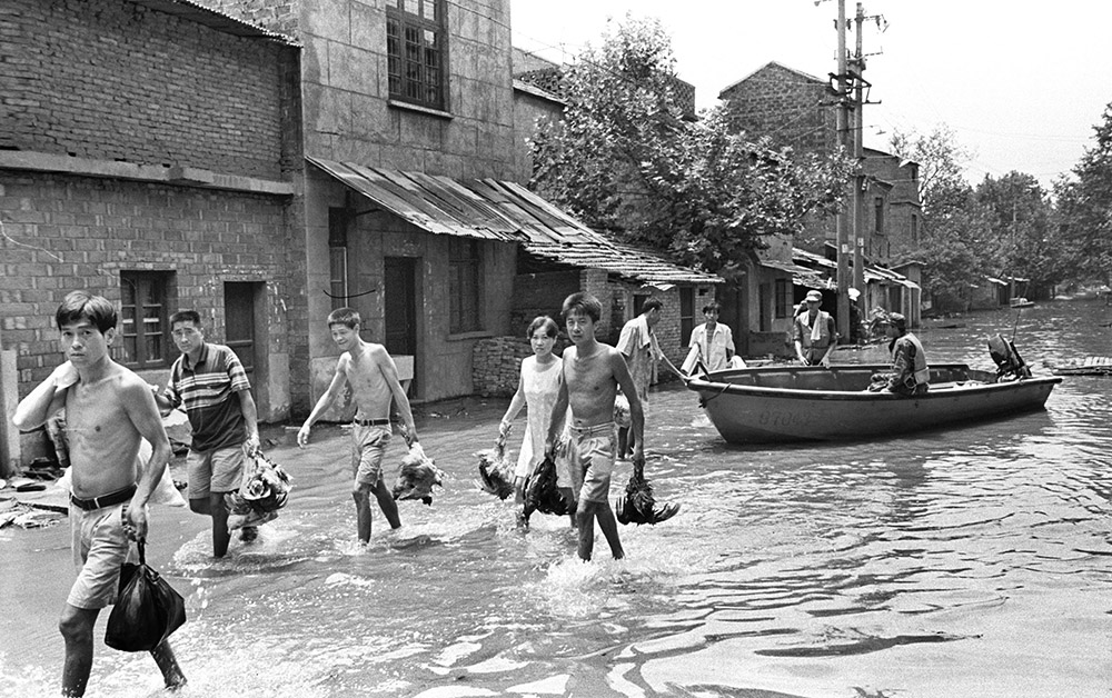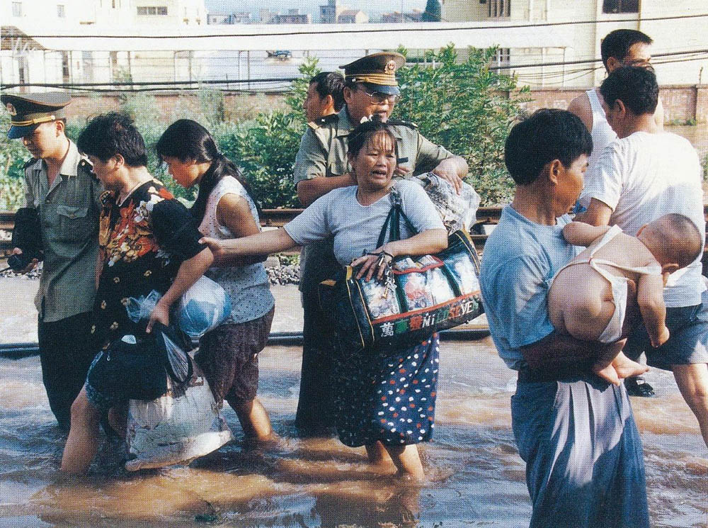1998年8月7日下午,九江长江大堤4—5号闸口决口后城西群众转移情景。