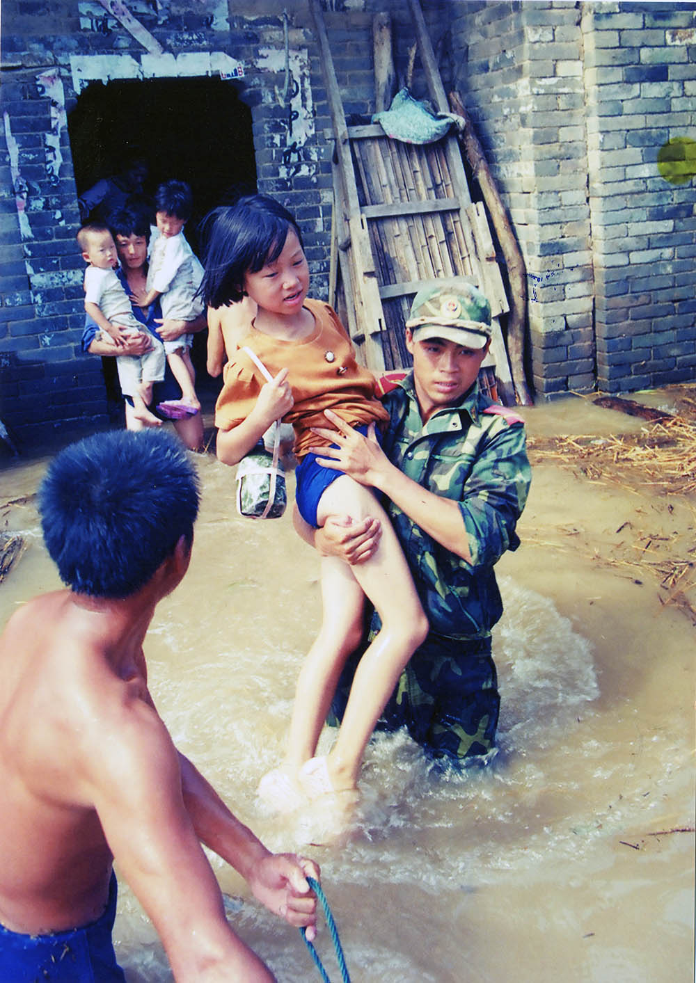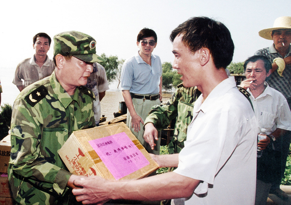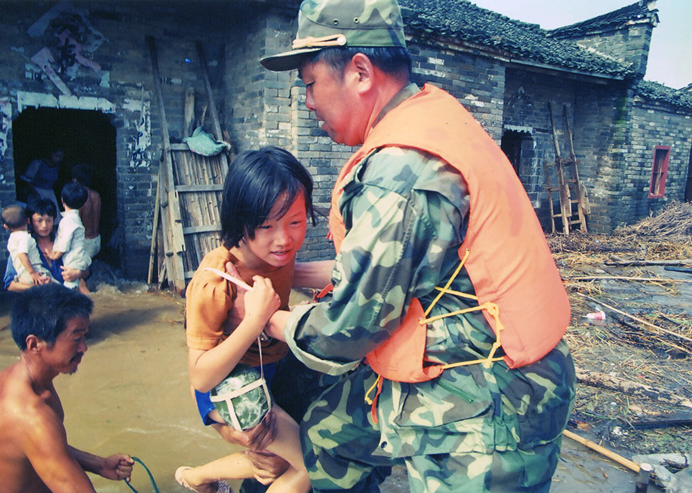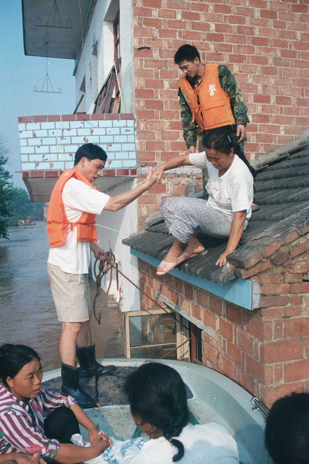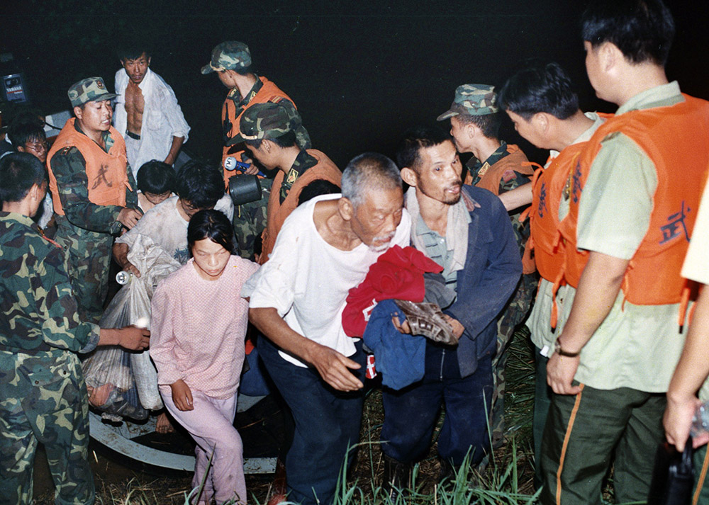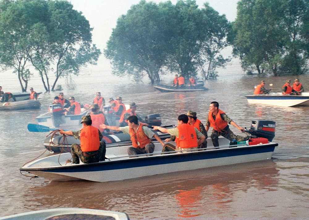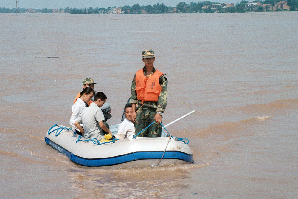 1998年8月4日晚,九江武警在洪水中救出被困的一家。  江洲决口后,武警九江市支队派出冲锋舟横渡长江进行营救。