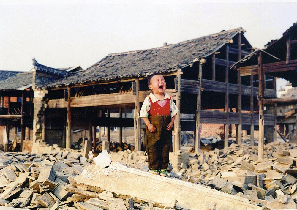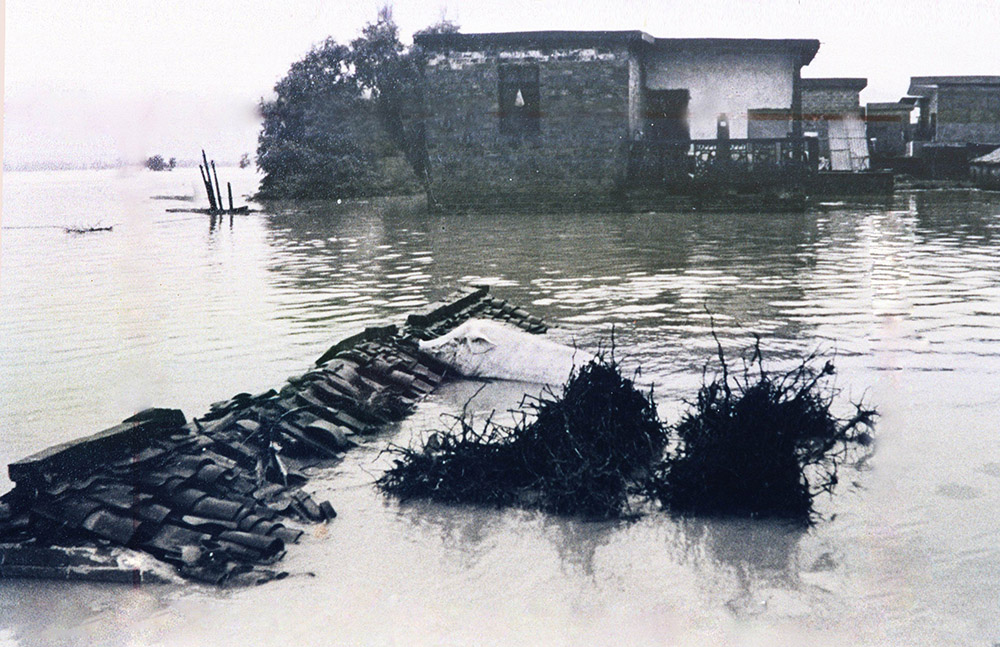 面对被洪水摧毁的房屋,星子县(现庐山市)小宝宝嚎啕大哭。