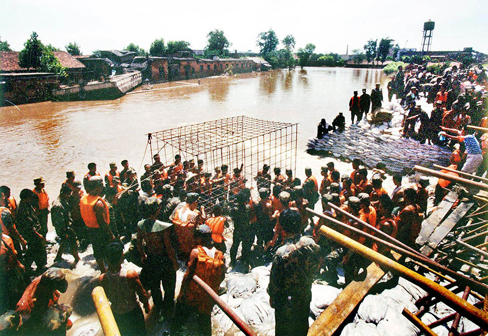 解放军官兵正在用最新的钢木土石组合坝封堵技术堵决口。