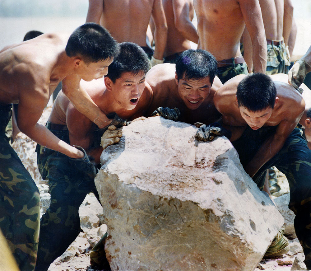 甩开膀子把巨大的石块投到激流中。