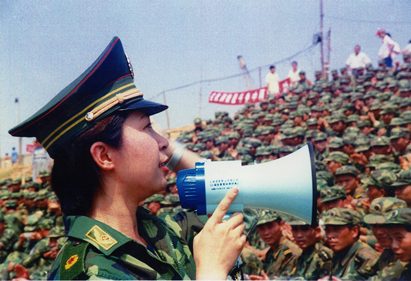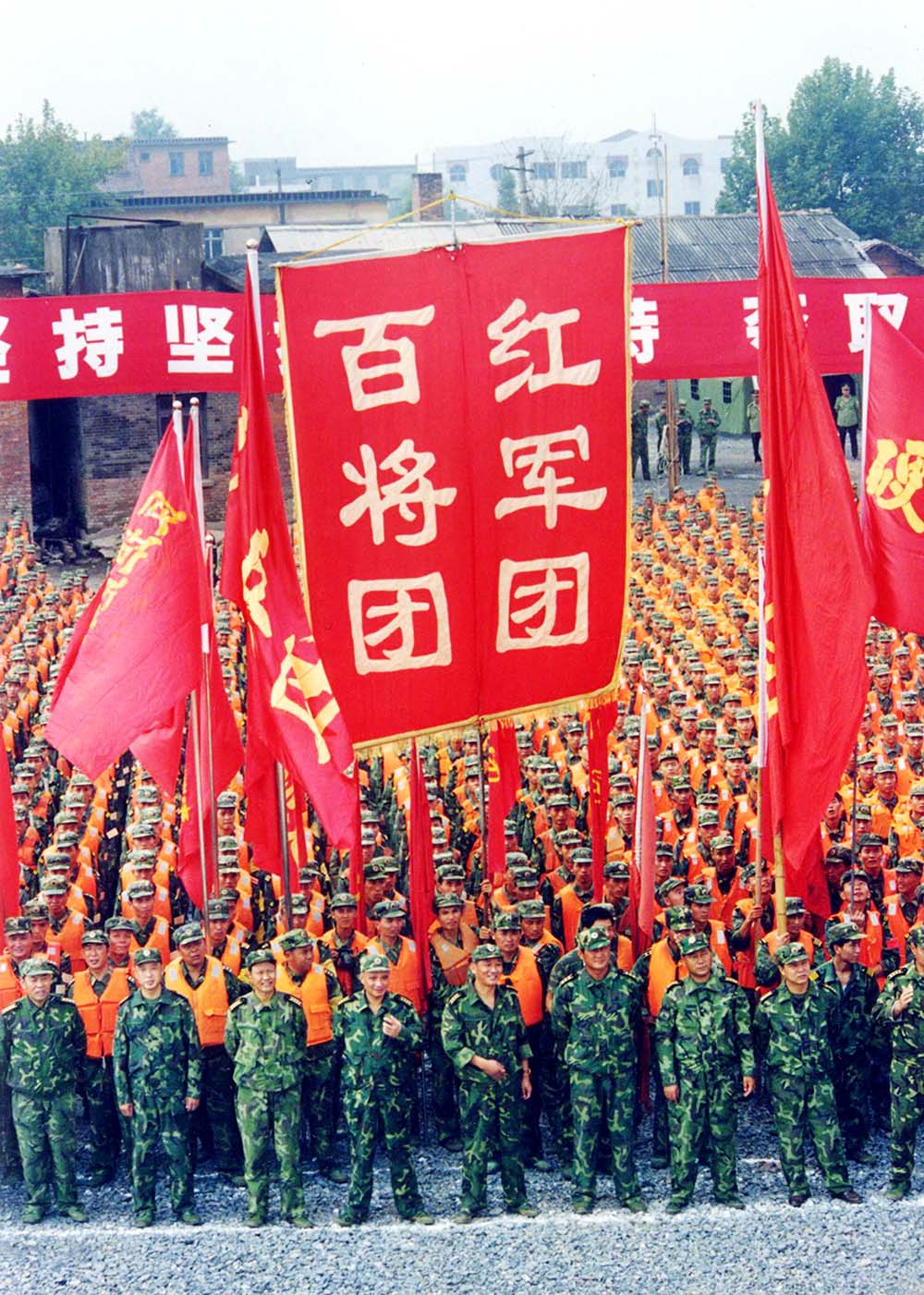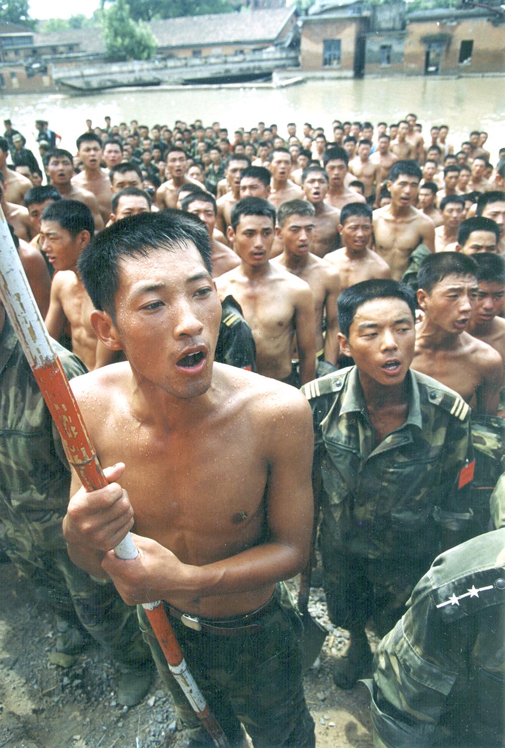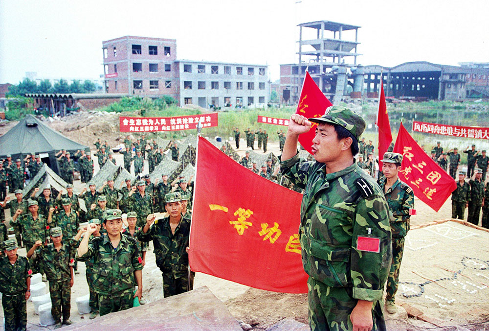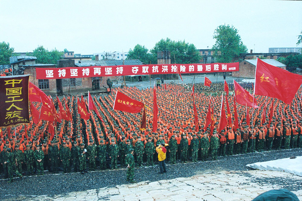部队官兵们在召开保卫长江大堤的誓师大会。