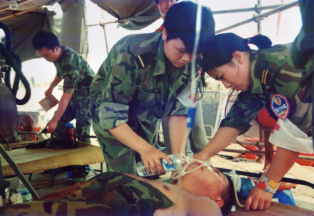 战士中暑倒下,医务人员及时进行抢救。