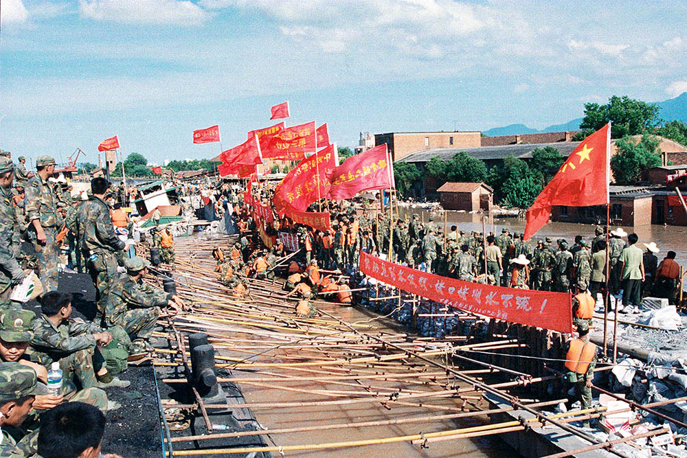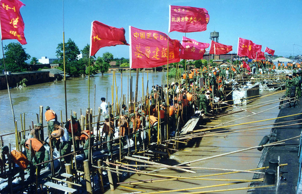驰援九江的抗洪大军,面对滔滔洪水发出了“誓与大堤共存亡!”的震天吼声。