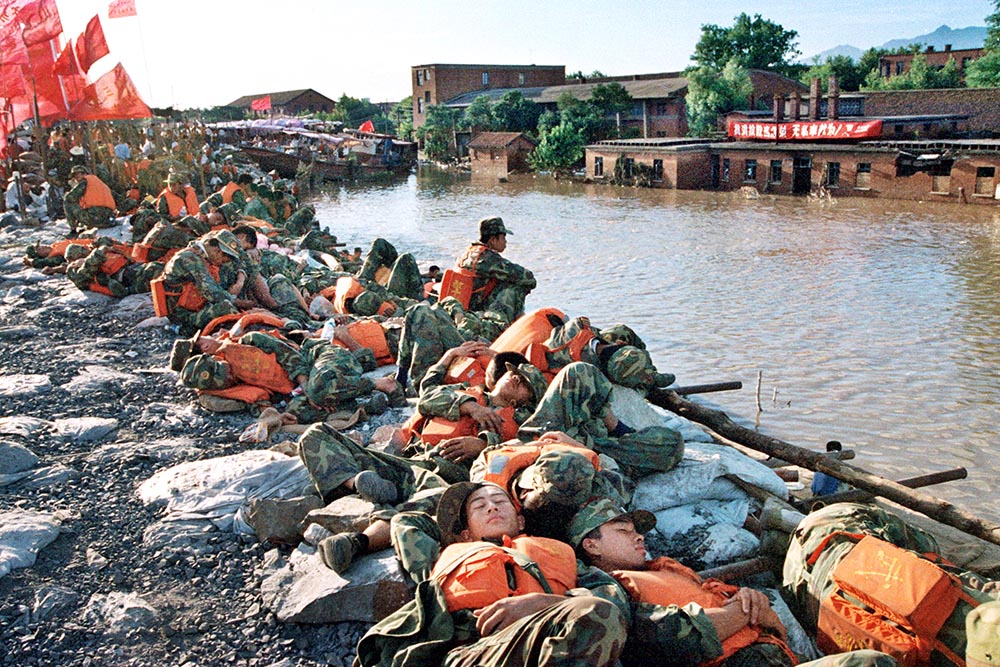 抗洪官兵就这样和衣小睡在长江大堤上。
