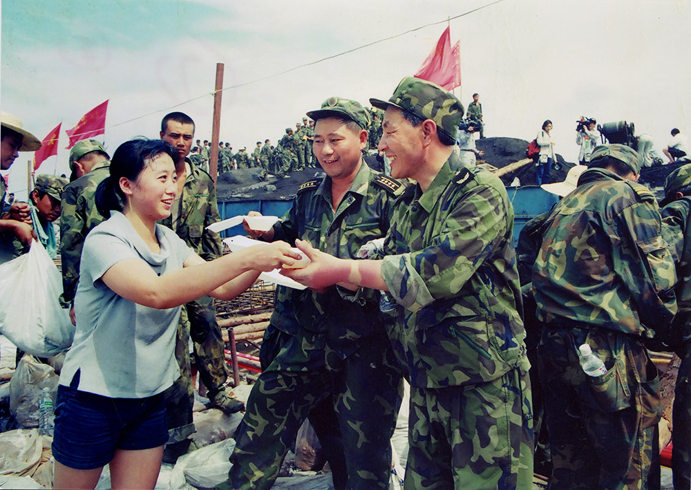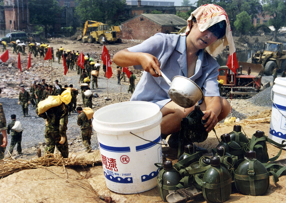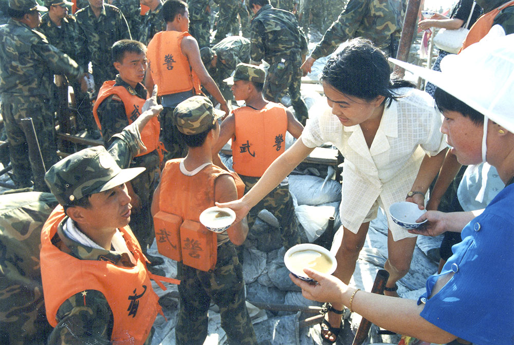 为酷暑中奋战的抗洪官兵送绿豆汤。