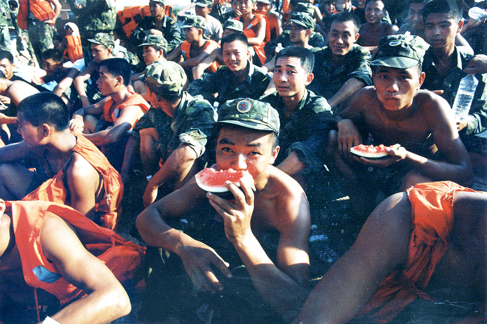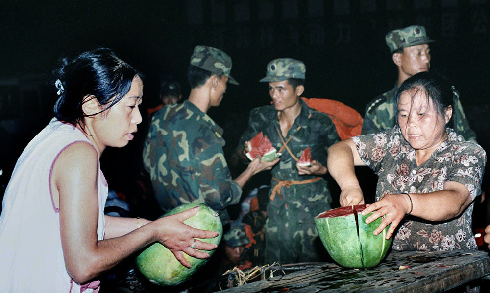 抗洪期间,浔城处处涌现军爱民、民拥军的感人场面,市民自费购买西瓜慰问抗洪官兵。
