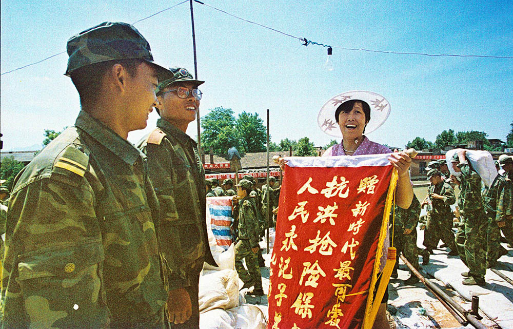 城西一妇女自发给堵口官兵送锦旗。