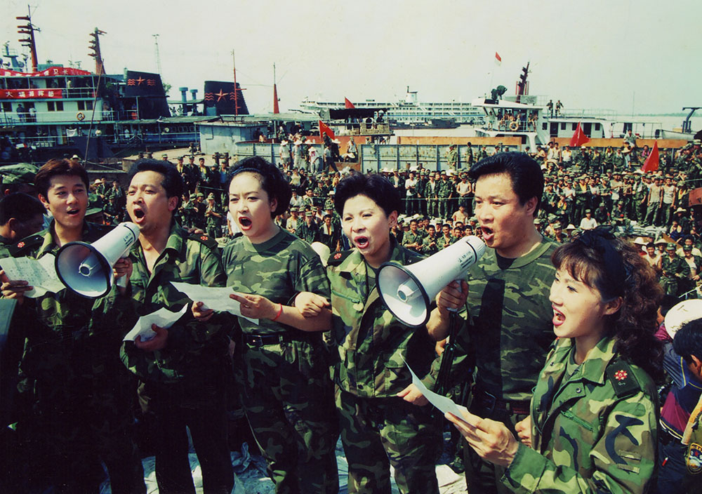 上海文艺工作者到抗洪前线进行慰问。
