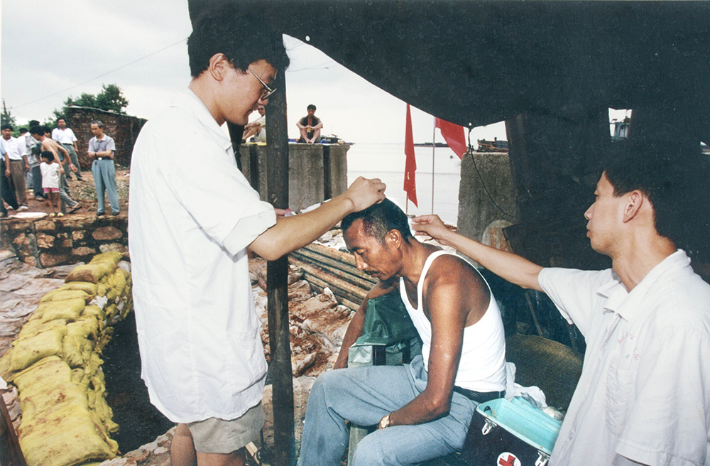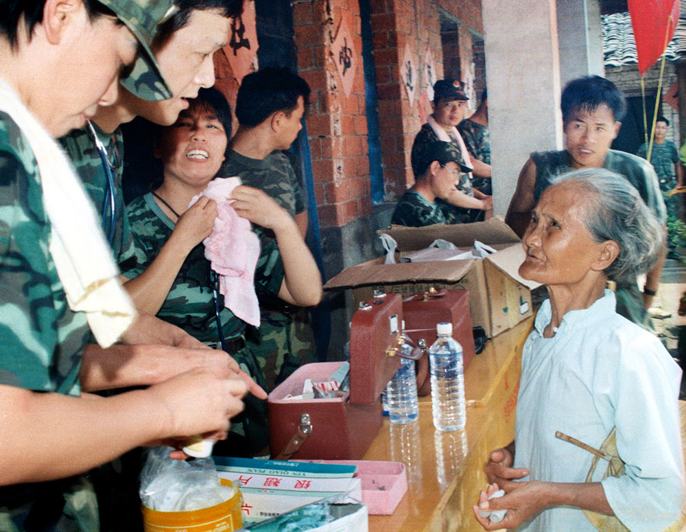 驻沪某部赴永修县抗洪部队为老百姓看病。