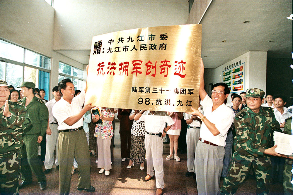 陆军第31集团军向九江市委、市政府赠送“抗洪拥军创奇迹”的牌匾。