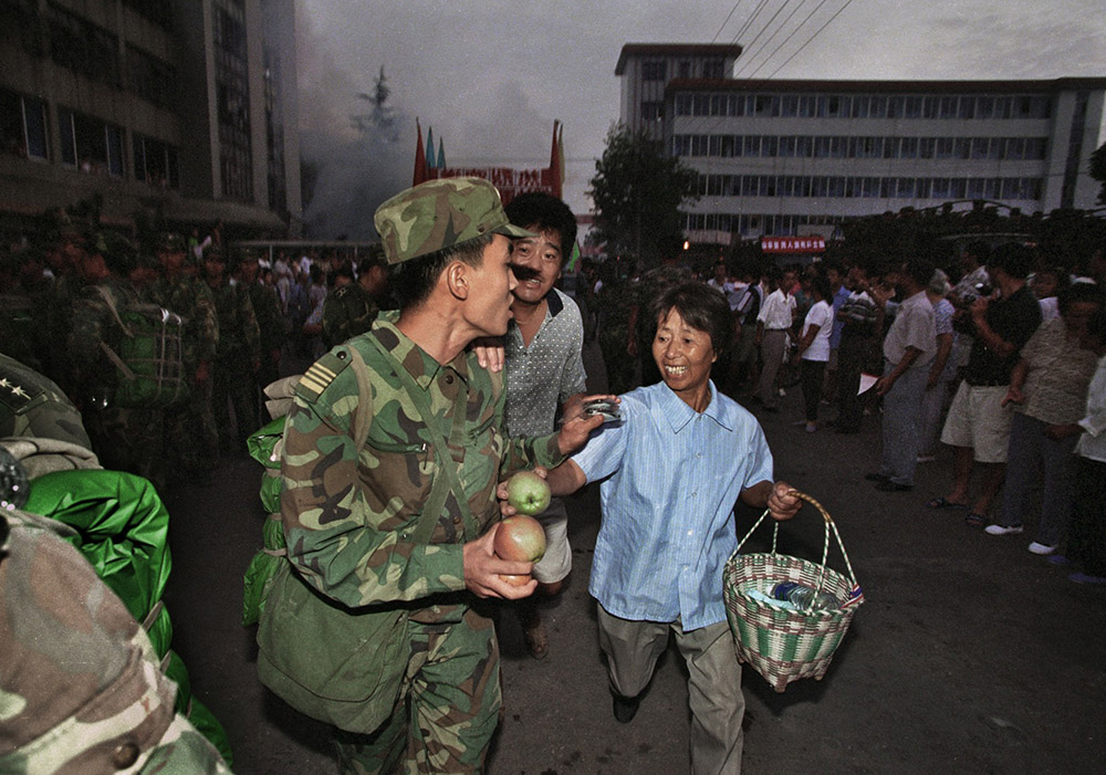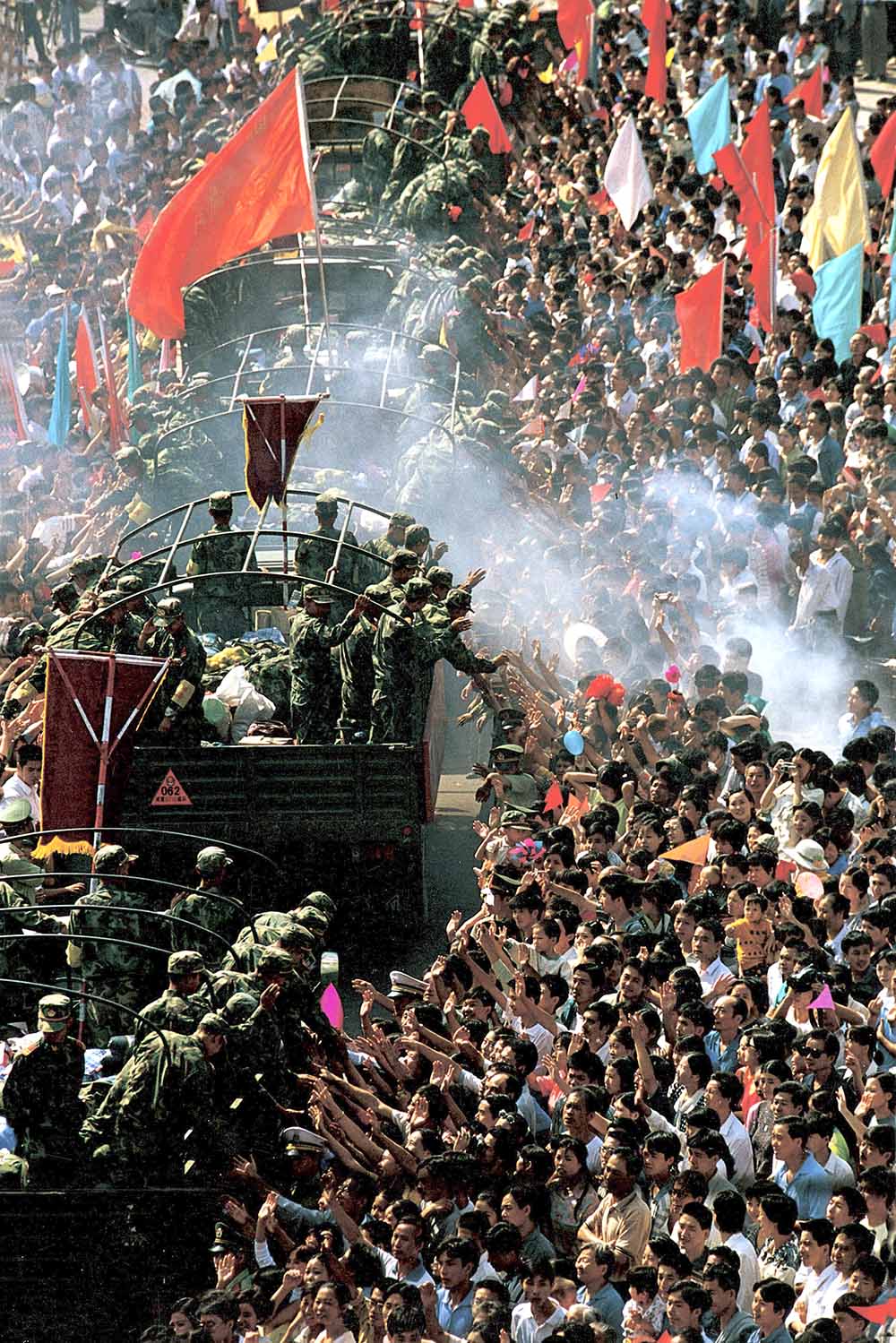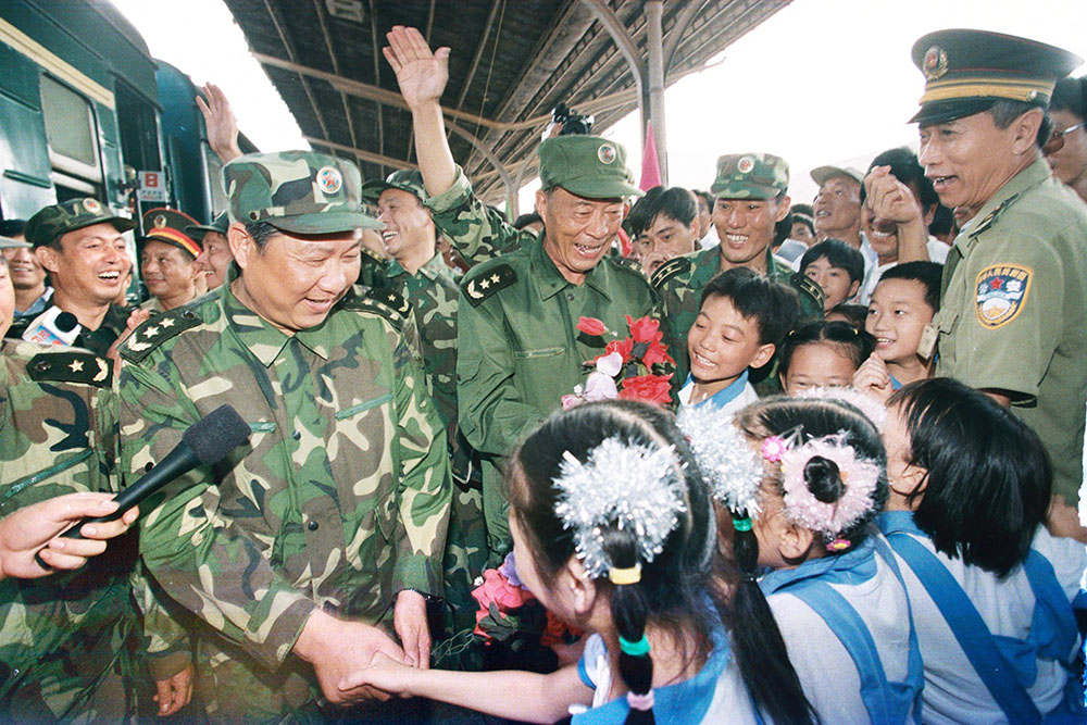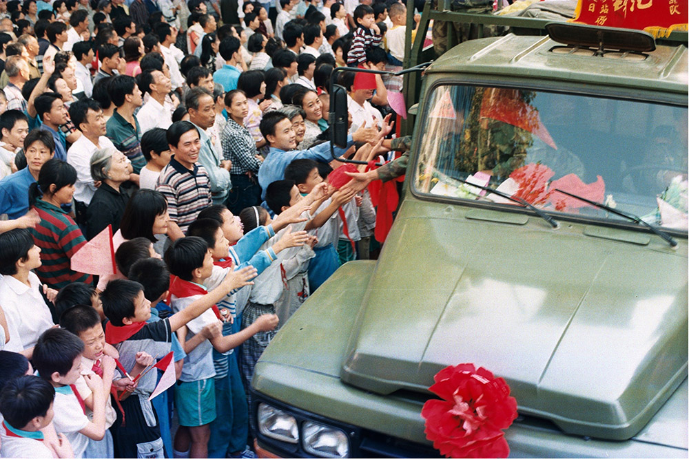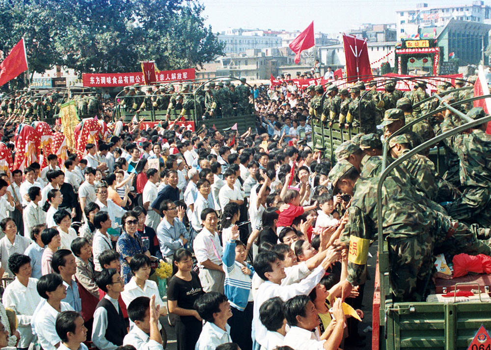 9月15日清晨5时,部队要班师凯旋,军车开出军营时,一拥而上的市民将手中的水果、鸡蛋等礼物塞给战士们。